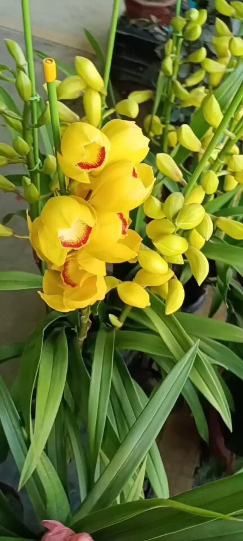 株型结构上,叶片呈碧绿油亮的长带状,叶姿优雅斜垂,长度约35公分左右,宽度适中,既不过于纤细也不显笨拙,整体株型紧凑端庄,与艳丽花朵形成刚柔并济的视觉效果。较具辨识度的是其花箭生长形态:花箭初期向上生长,后期逐渐低垂形成独特的拱门形状,这也是“拱兰”命名的由来,与普通大花蕙兰垂直向上的花箭形成明显区别,单杆着花数可达4-7朵,花箭挺拔度适中,花朵排列错落有致,整体观赏协调性较强。